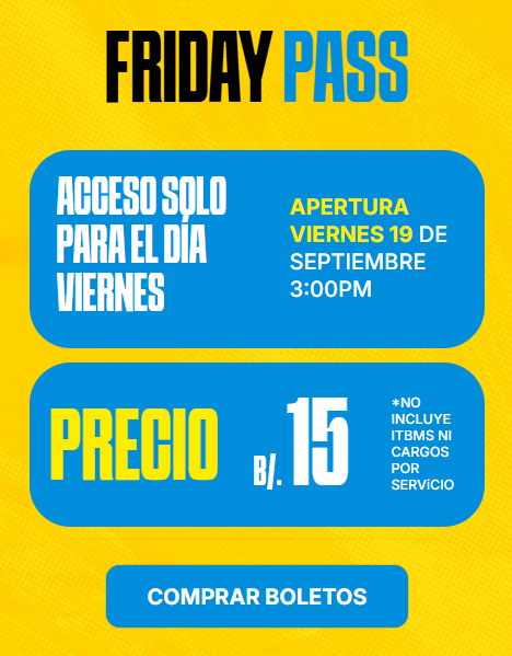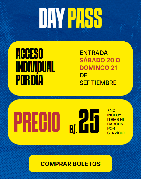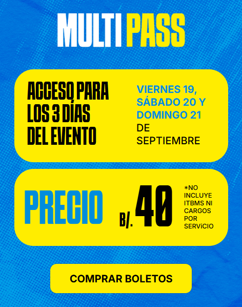 • Multi‑Pass (acceso los tres días): B/. 40 (no incluye ITBMS ni cargos por servicio)